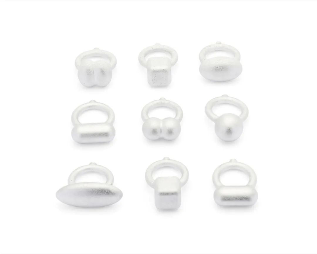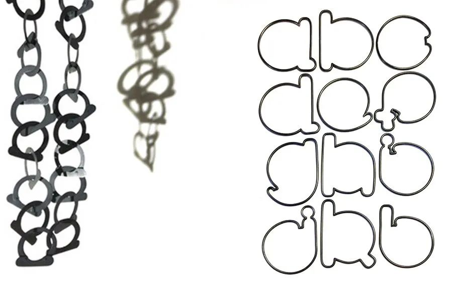 Roseanne 的最新作品將字母表視為一種觸覺(jué)系統(tǒng)。她測(cè)試了字體設(shè)計(jì)的解剖結(jié)構(gòu),以響應(yīng)裝飾的具體條件。該項(xiàng)目將基于字體的探究擴(kuò)展到珠寶領(lǐng)域,包括字母項(xiàng)鏈、耳環(huán)、手鐲和戒指。每件珠寶都為字形字符和佩戴者的身體之間的互動(dòng)創(chuàng)造了機(jī)會(huì)。
