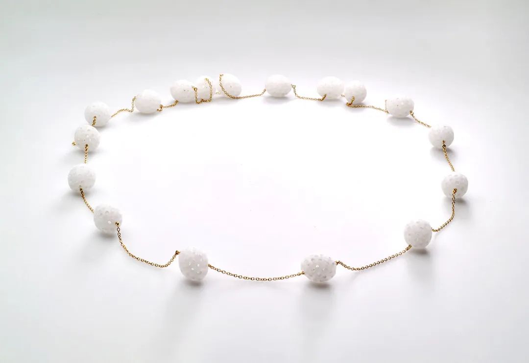 我使用了捐贈(zèng)的材料,從耳環(huán)單件到破損的耳環(huán)、人造珍珠和未知材質(zhì)的珠子、帶水鉆的人造珠寶、純銀和 14k 金不想要的物品。我創(chuàng)作的一些作品更為激進(jìn)(例如 Drippy 項(xiàng)鏈),而有些則更為虔誠(chéng)和傳統(tǒng)(Orphan 吊墜項(xiàng)鏈)。其中一件作品與我的鋼和金作品有關(guān)(甜美的金色 Paperchain Cluster 耳釘),但大多數(shù)作品的靈感都來(lái)自我手頭材料中看到的東西。我借鑒了我的銀匠培訓(xùn)(Salamander 項(xiàng)鏈)、我的設(shè)計(jì)教育(使用不同的材料),并學(xué)習(xí)了一種新的打結(jié)技術(shù)。感覺(jué)就像一個(gè)充滿不斷探索和實(shí)驗(yàn)的駐地,我將把這些探索和實(shí)驗(yàn)帶到未來(lái)的新作品中。