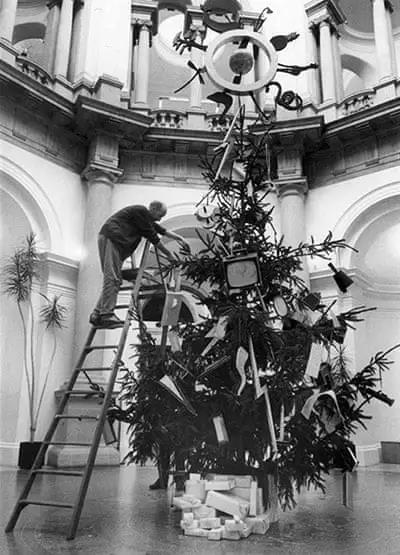 英國(guó)雕塑家 Bill Woodrow 是第一個(gè)被泰特美術(shù)館邀請(qǐng)?jiān)O(shè)計(jì)圣誕樹的藝術(shù)家,他的設(shè)計(jì)概念是關(guān)于地球生態(tài),圣誕樹由一個(gè)大的地球儀和用硬紙板制作的地圖模型裝飾。