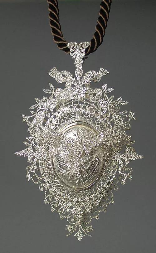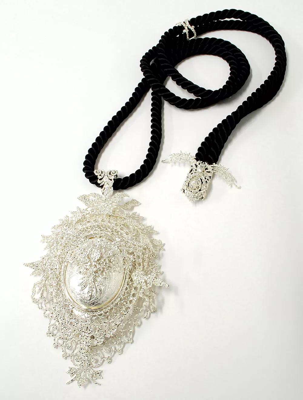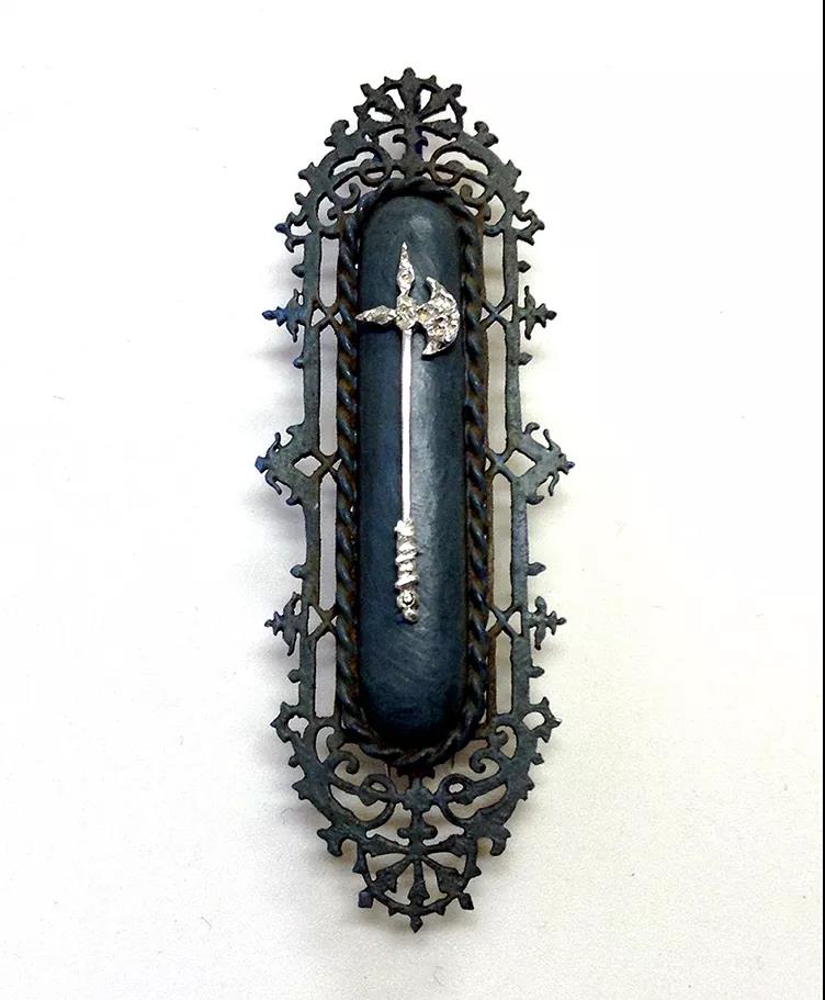“田口史樹通過對(duì)主題和材質(zhì)的巧妙處理,重新詮釋了胸針和吊墜。他的首飾似乎被精美的寶石所迷惑,通過不同的切割和角度折射出線條,藝術(shù)家通過將純銀雕鑿成一種模擬鉆石等寶石的光澤來達(dá)到這種效果。田口對(duì)銀的使用指向首飾價(jià)值的建構(gòu),暗示銀與貴重的巖石一樣光芒四射。田口曾說:“在不鑲嵌任何寶石的情況下,我常常使用制作寶石的結(jié)構(gòu)來呈現(xiàn)金屬本身的力量和精致感。”胸針和吊墜類似于家族徽章或盾徽;通過破壞物質(zhì)象征和清空徽章的肖像,胸針成為超越舊血統(tǒng)的新型關(guān)系的容器。”