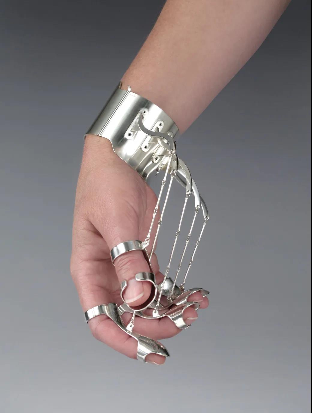 在她的系列作品《Ornamental Hands》中,手與鋁或純銀制的結(jié)構(gòu)性金屬附件擺出了多種形態(tài),在傳統(tǒng)藝術(shù)歷史繪畫中常能找到這樣的形式。