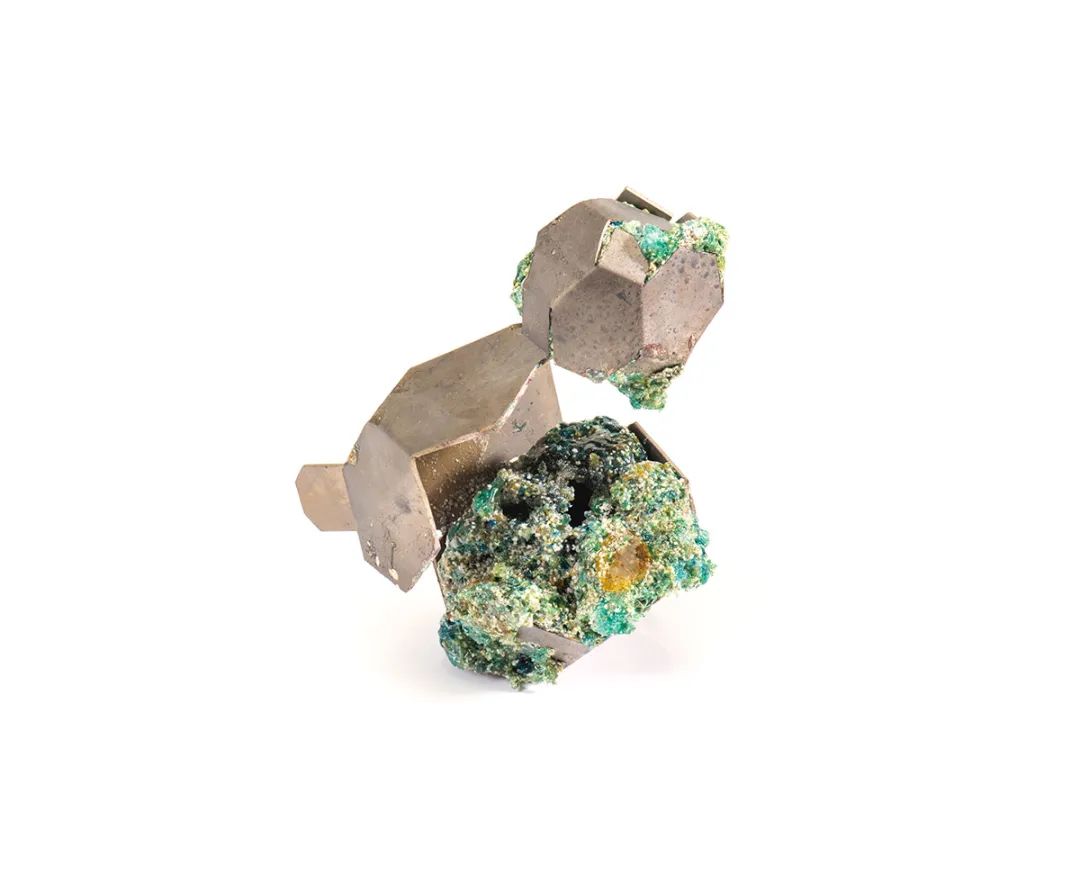 Recycled PET plastic from water and soft drink bottles, epoxy resin, nickel silver and patinated copper