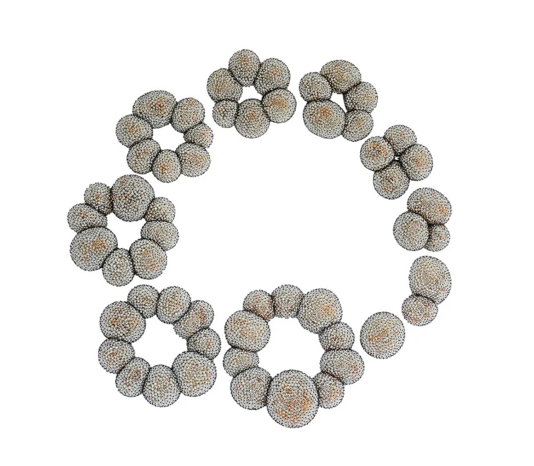 本次展覽包括戒指、項鏈和胸針,以及用于存放部分作品的手繪古董木制米盒。這些出色的作品靈感來自于藝術家Kageyama(影山)位于東京郊外富士山附近居所周圍的自然環(huán)境,在那里他可以清楚地看到夜空。為了制作這些令人眼花繚亂的作品,金匠大師影山使用了具有 300 年歷史的大漆碎片,這些大漆由大漆樹的有毒樹液制成。通過結合其他天然材料,如珍珠母、純金、朱砂和璀璨的巴洛克珍珠,以喚起黑洞、太陽和月亮等星系體的聯想。對于“黑洞”胸針,影山著眼于古埃及人對天文學的研究及其與金字塔的關聯。